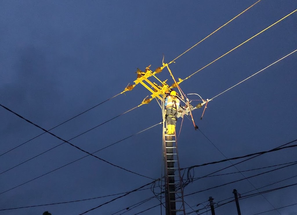 | Tak mengenal waktu, petugas PLN bahu membahu untuk memulihkan gangguan sistem kelistrikan di Belitung. FOTO DOK PLN |